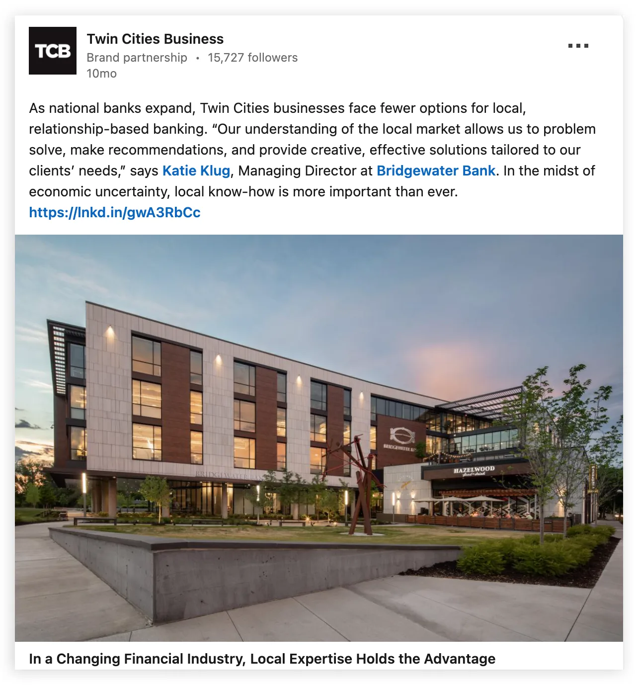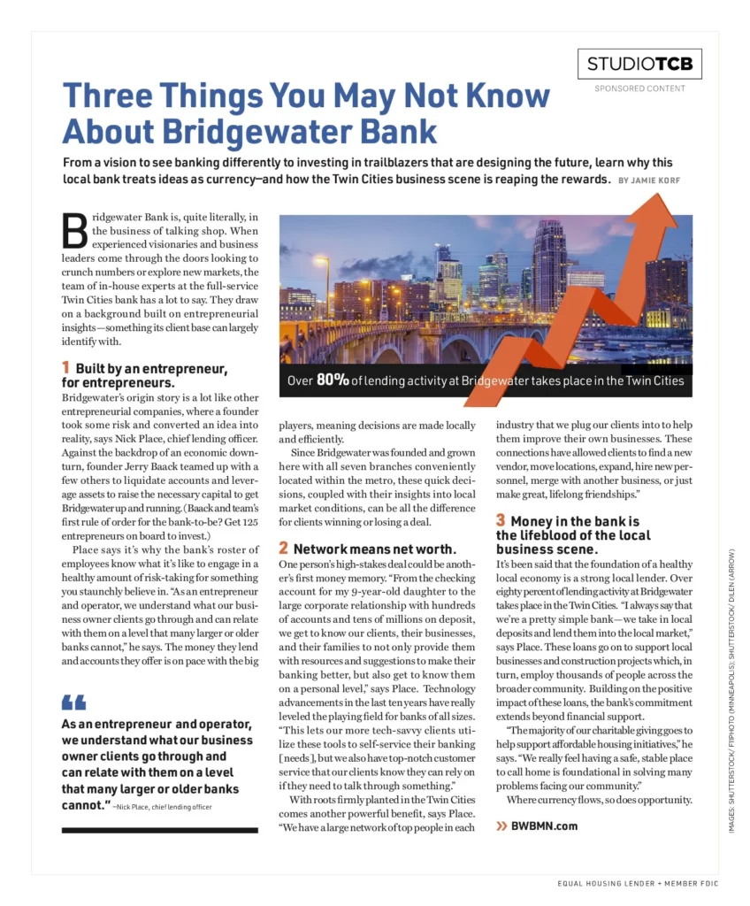A bi-monthly integrated series in Twin Cities Business positioned Bridgewater at the center of the region’s entrepreneurial conversation, spotlighting its suite of products and services, elevating client success stories through case-study storytelling, and bringing its leadership and culture to life through original photography.