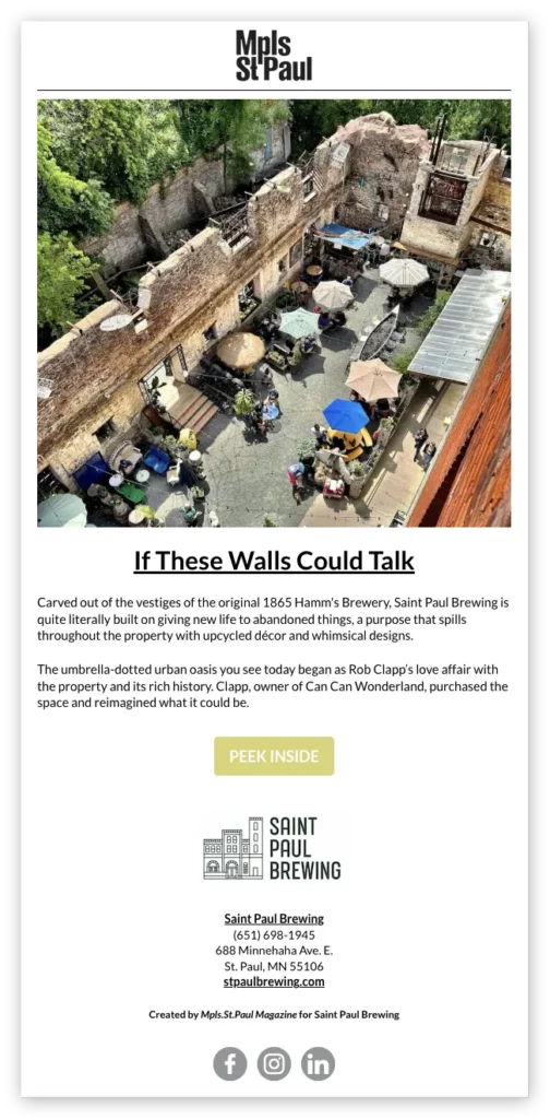 A storied pillar of our east side community, Saint Paul Brewing tapped Studio MSP to increase awareness of its vast offerings—ranging far beyond that of a typical brewery—while conveying its creative roots and artsy inclinations through design and storytelling.
